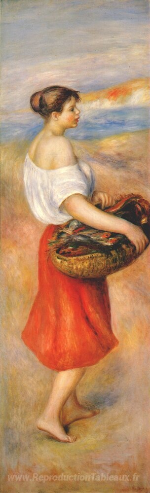 Nous vous proposons une reproduction artisanale sur toile du célèbre tableau 'Fille avec un panier de poisson' de Pierre-Auguste Renoir, provenant du Musée de la Reproduction.