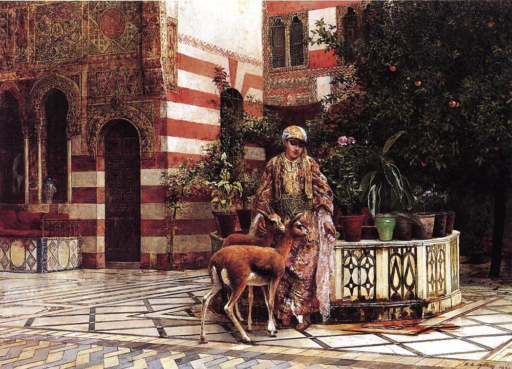 Nous vous proposons une reproduction artisanale sur toile du célèbre tableau 'Fille dans une cour maure' de Edwin Lord Weeks, provenant du Musée de la Reproduction.
