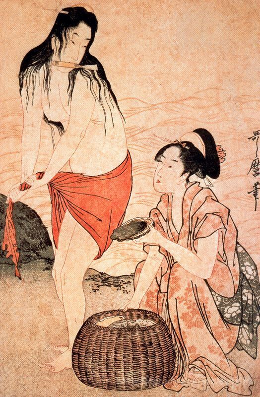 Nous vous proposons une reproduction artisanale sur toile du célèbre tableau 'Filles perl-rivers' de Kitagawa Utamaro, provenant du Musée de la Reproduction.