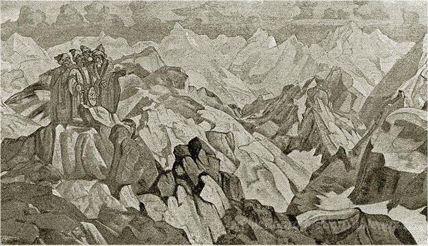 Nous vous proposons une reproduction artisanale sur toile du célèbre tableau 'Frontière des royaumes' de Nicholas Roerich, provenant du Musée de la Reproduction.