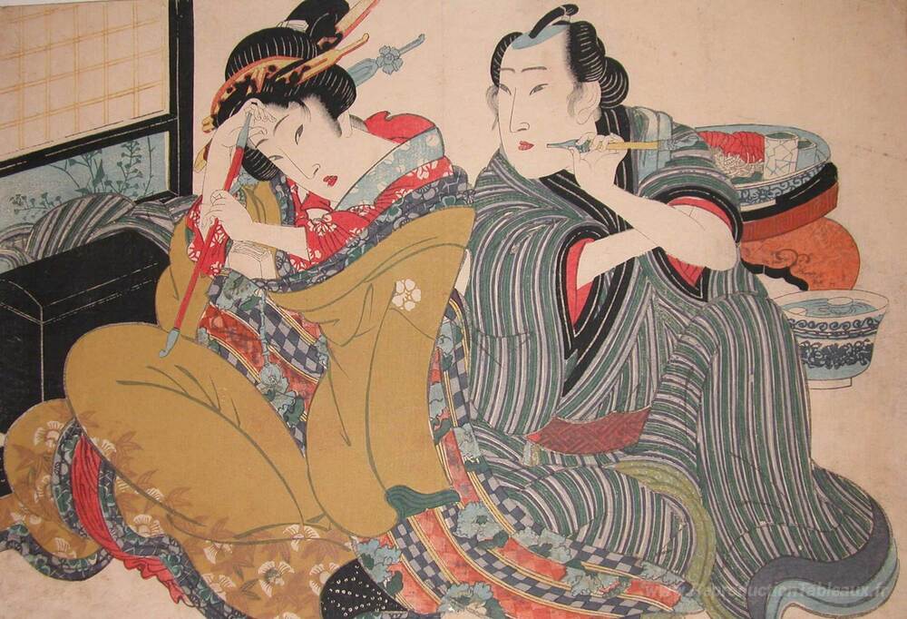 Nous vous proposons une reproduction artisanale sur toile du célèbre tableau 'Fumeurs de pipe' de Keisai Eisen, provenant du Musée de la Reproduction.