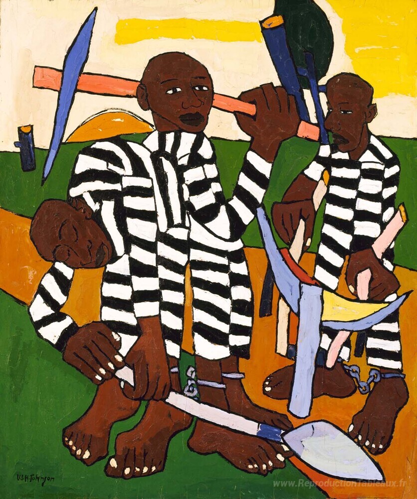 Nous vous proposons une reproduction artisanale sur toile du célèbre tableau 'Gang de chaîne' de William H. Johnson, provenant du Musée de la Reproduction.