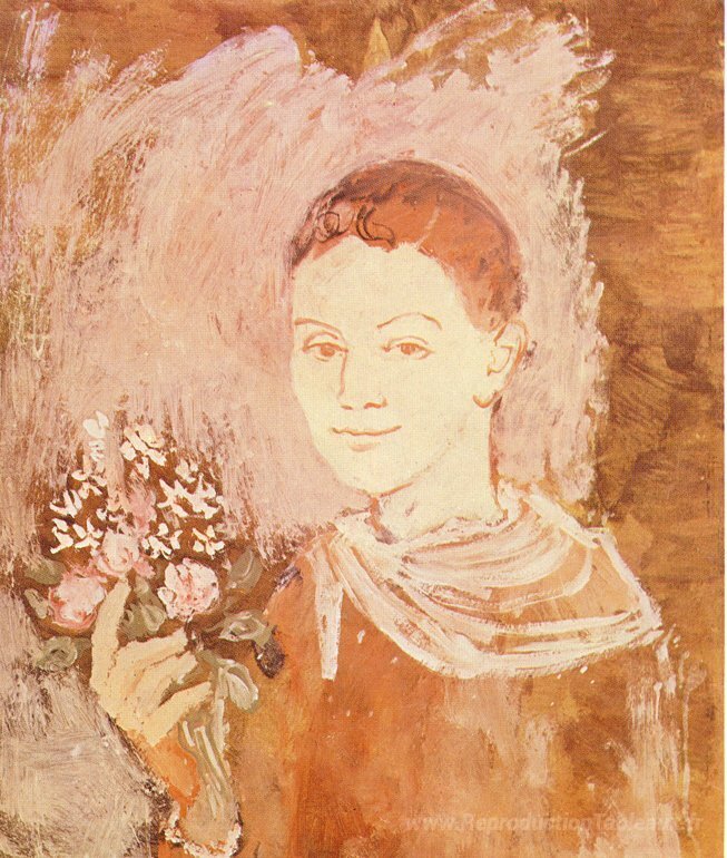 Nous vous proposons une reproduction artisanale sur toile du célèbre tableau 'Garçon avec bouquet de fleurs dans sa main' de Pablo Picasso, provenant du Musée de la Reproduction.