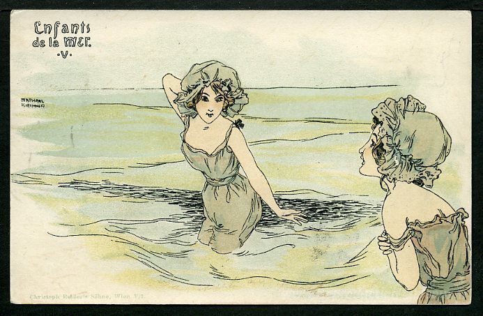 Nous vous proposons une reproduction artisanale sur toile du célèbre tableau 'Garçons et filles en mer' de Raphael Kirchner, provenant du Musée de la Reproduction.