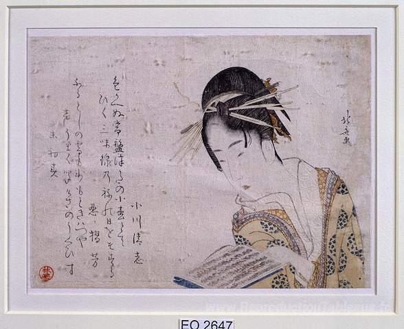 Nous vous proposons une reproduction artisanale sur toile du célèbre tableau 'Geisha lisant un livre' de Katsushika Hokusai, provenant du Musée de la Reproduction.