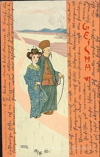 Nous vous proposons une reproduction artisanale sur toile du célèbre tableau 'Geisha' de Raphael Kirchner, provenant du Musée de la Reproduction.