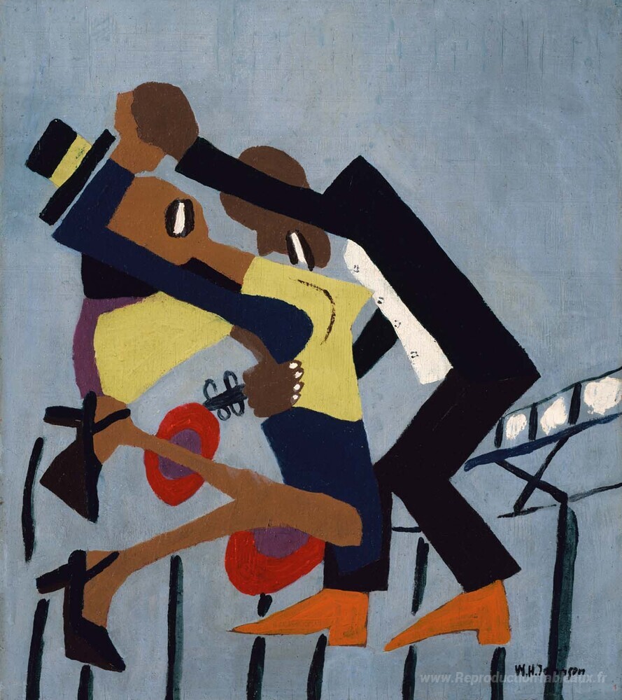 Nous vous proposons une reproduction artisanale sur toile du célèbre tableau 'Gli allegri imbroglioni (III)' de William H. Johnson, provenant du Musée de la Reproduction.