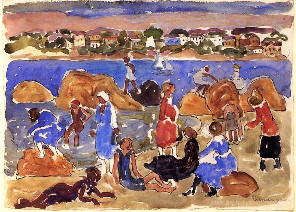 Nous vous proposons une reproduction artisanale sur toile du célèbre tableau 'Gloucester, maisons de pêcheurs' de Maurice Prendergast, provenant du Musée de la Reproduction.