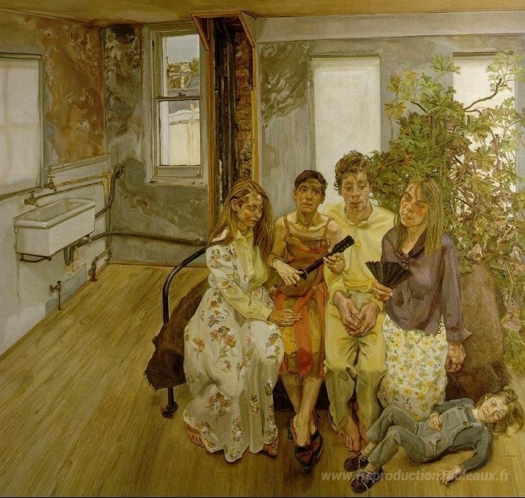 Nous vous proposons une reproduction artisanale sur toile du célèbre tableau 'Grand intérieur W11 (après Watteau)' de Lucian Freud, provenant du Musée de la Reproduction.
