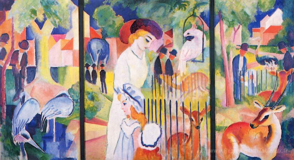 Nous vous proposons une reproduction artisanale sur toile du célèbre tableau 'Grand zoo, triptyque' de August Macke, provenant du Musée de la Reproduction.
