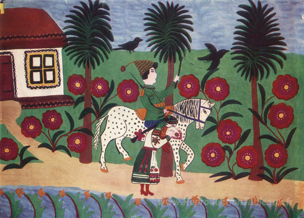 Nous vous proposons une reproduction artisanale sur toile du célèbre tableau 'Halia et cosaque' de Maria Primachenko, provenant du Musée de la Reproduction.