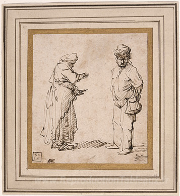 Nous vous proposons une reproduction artisanale sur toile du célèbre tableau 'Homme et femme mendiant' de Rembrandt, provenant du Musée de la Reproduction.