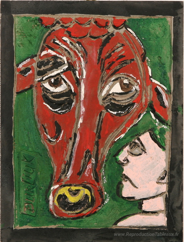 Nous vous proposons une reproduction artisanale sur toile du célèbre tableau 'Homme et vache' de David Burliuk, provenant du Musée de la Reproduction.