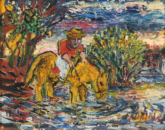 Nous vous proposons une reproduction artisanale sur toile du célèbre tableau 'Homme sur un cheval jaune' de David Burliuk, provenant du Musée de la Reproduction.
