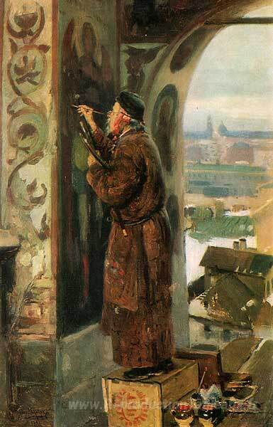 Nous vous proposons une reproduction artisanale sur toile du célèbre tableau 'Iconographe' de Vladimir Makovsky, provenant du Musée de la Reproduction.