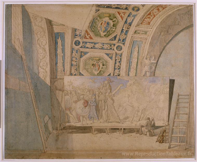 Nous vous proposons une reproduction artisanale sur toile du célèbre tableau 'Ingres dans son studio, peignant le vainqueur de Romulus d'Acron' de Jean Auguste Dominique Ingres, provenant du Musée de la Reproduction.