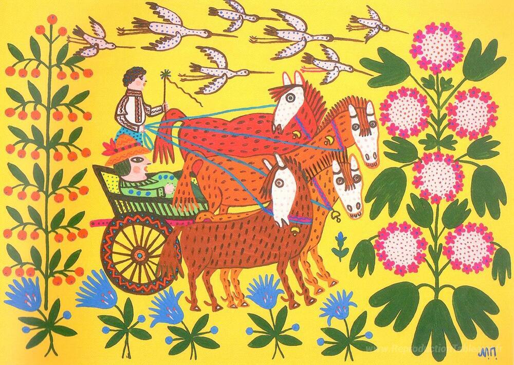Nous vous proposons une reproduction artisanale sur toile du célèbre tableau 'Ivan a fait un tour du propriétaire dans son concert et est tomb' de Maria Primachenko, provenant du Musée de la Reproduction.