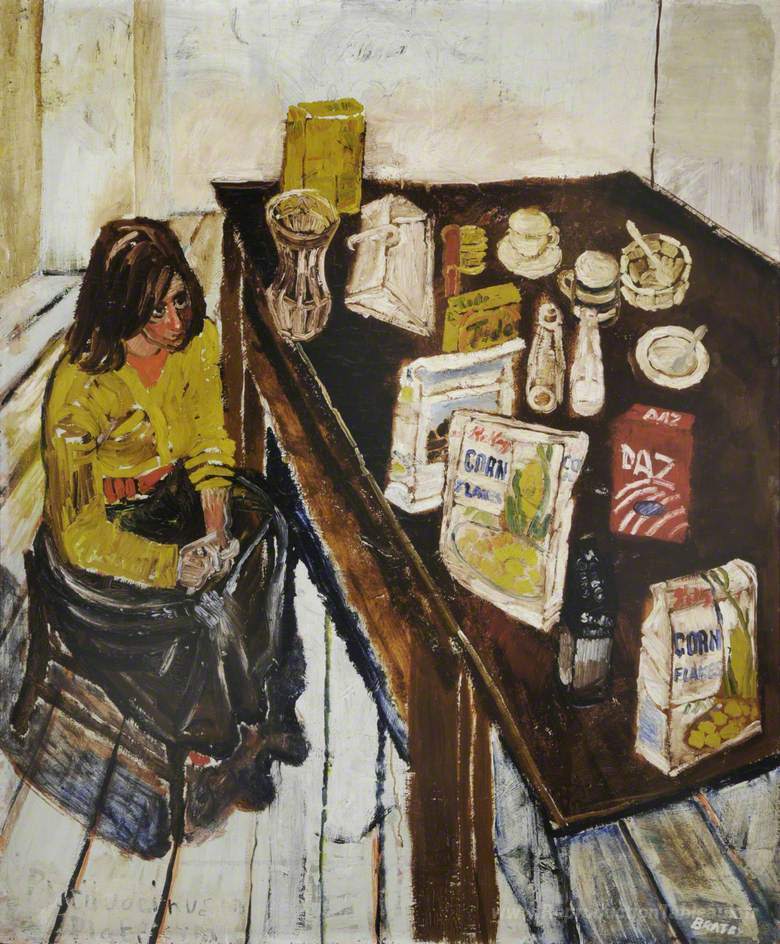 Nous vous proposons une reproduction artisanale sur toile du célèbre tableau 'Jean et table de table (fille dans un pull jaune)' de John Bratby, provenant du Musée de la Reproduction.