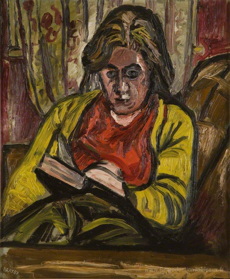Nous vous proposons une reproduction artisanale sur toile du célèbre tableau 'Jean Reading' de John Bratby, provenant du Musée de la Reproduction.