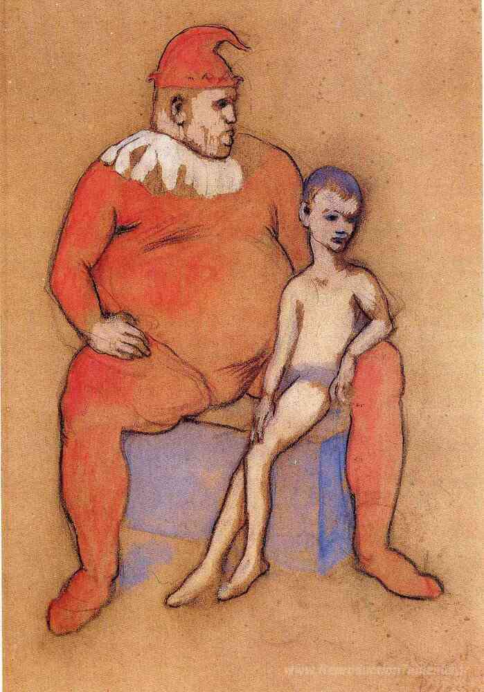 Nous vous proposons une reproduction artisanale sur toile du célèbre tableau 'Jeune acrobate et clown' de Pablo Picasso, provenant du Musée de la Reproduction.