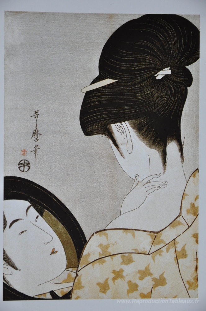 Nous vous proposons une reproduction artisanale sur toile du célèbre tableau 'Jeune femme appliquant le maquillage' de Kitagawa Utamaro, provenant du Musée de la Reproduction.