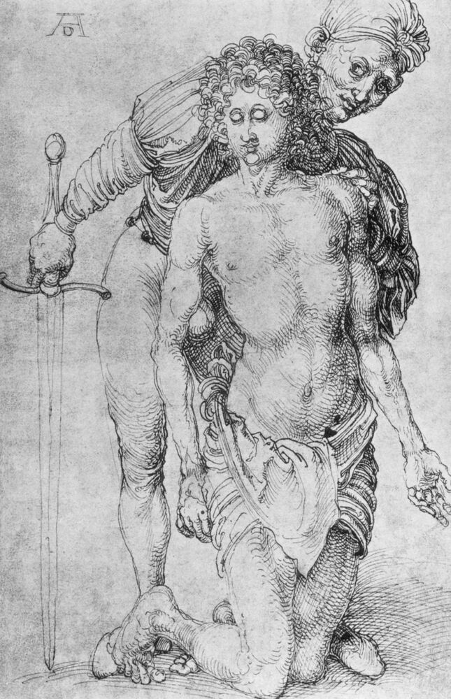 Nous vous proposons une reproduction artisanale sur toile du célèbre tableau 'Jeunes avec le bourreau' de Albrecht Durer, provenant du Musée de la Reproduction.