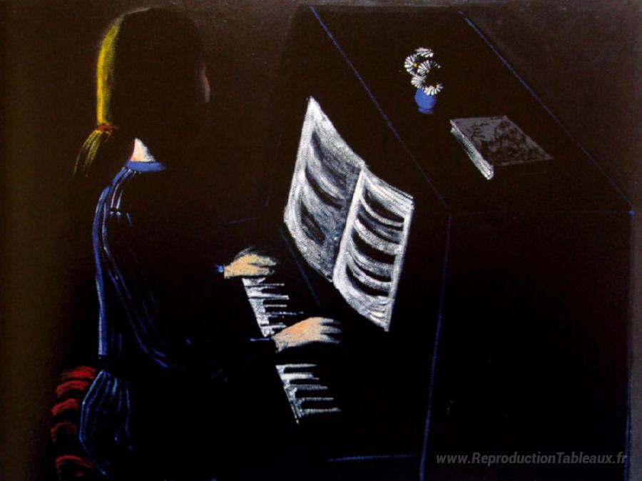 Nous vous proposons une reproduction artisanale sur toile du célèbre tableau 'Jouer à Mozart' de Charles Blackman, provenant du Musée de la Reproduction.