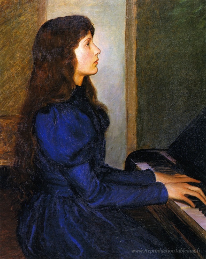 Nous vous proposons une reproduction artisanale sur toile du célèbre tableau 'Jouer par cœur' de Lilla Cabot Perry, provenant du Musée de la Reproduction.