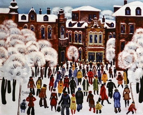 Nous vous proposons une reproduction artisanale sur toile du célèbre tableau 'Jour d'hiver dans la ville' de Radi Nedelchev, provenant du Musée de la Reproduction.