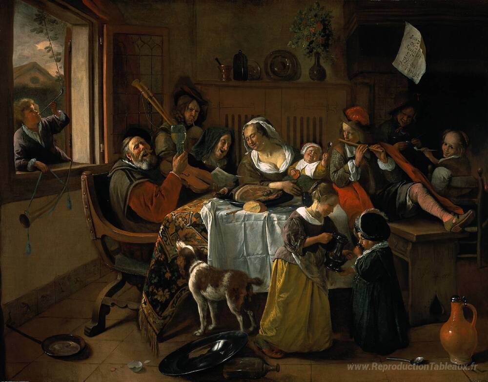 Nous vous proposons une reproduction artisanale sur toile du célèbre tableau 'Joyeux' de Jan Steen, provenant du Musée de la Reproduction.
