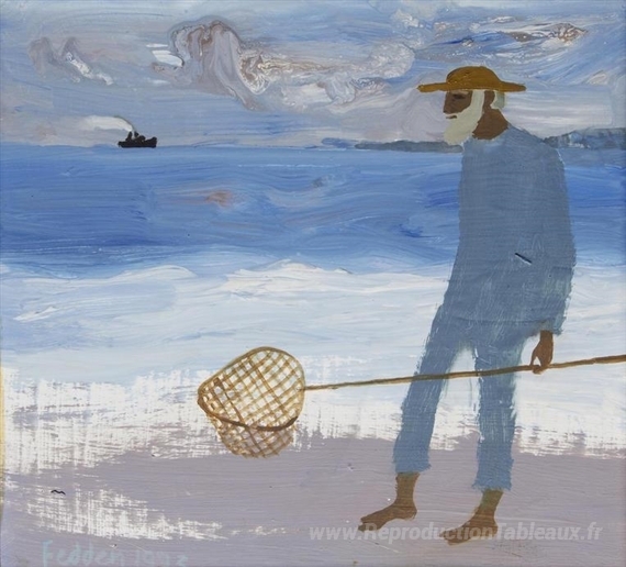 Nous vous proposons une reproduction artisanale sur toile du célèbre tableau 'Julian avec un filet de pêche' de Mary Fedden, provenant du Musée de la Reproduction.