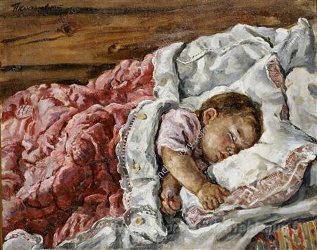 Nous vous proposons une reproduction artisanale sur toile du célèbre tableau 'Katya dormant (sur le côté gauche)' de Pyotr Konchalovsky, provenant du Musée de la Reproduction.