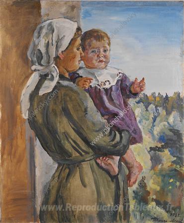 Nous vous proposons une reproduction artisanale sur toile du célèbre tableau 'Katya sur les genoux (une infirmière)' de Pyotr Konchalovsky, provenant du Musée de la Reproduction.