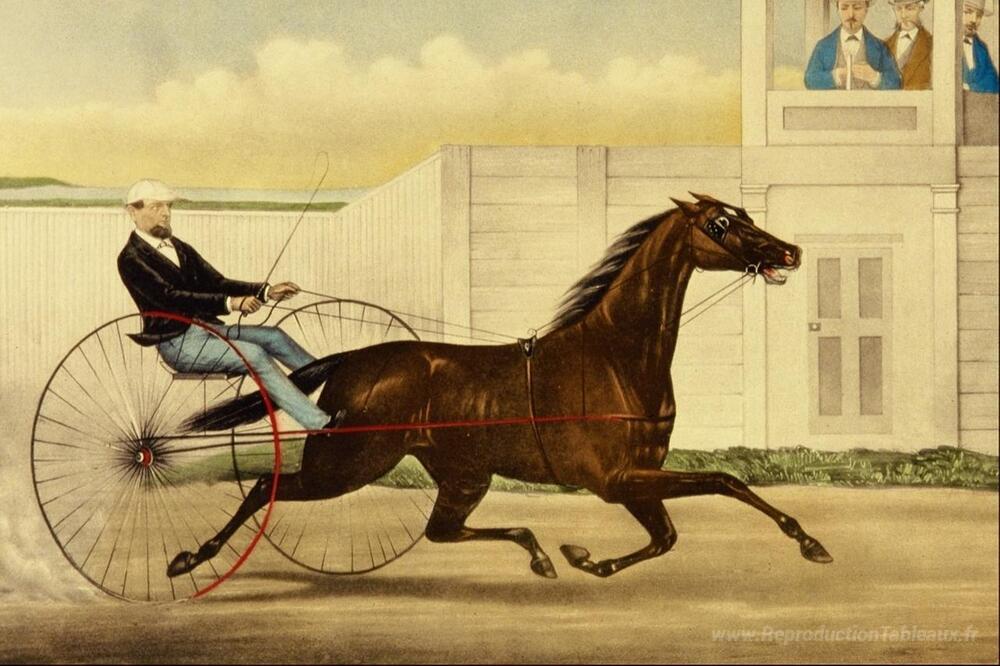 Nous vous proposons une reproduction artisanale sur toile du célèbre tableau 'La célèbre jument trotting Lucy' de Currier and Ives, provenant du Musée de la Reproduction.
