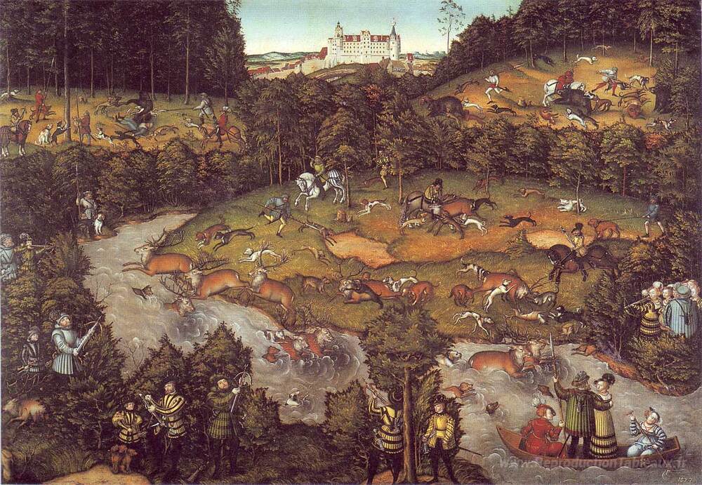 Nous vous proposons une reproduction artisanale sur toile du célèbre tableau 'La chasse aux cerfs' de Lucas Cranach the Elder, provenant du Musée de la Reproduction.