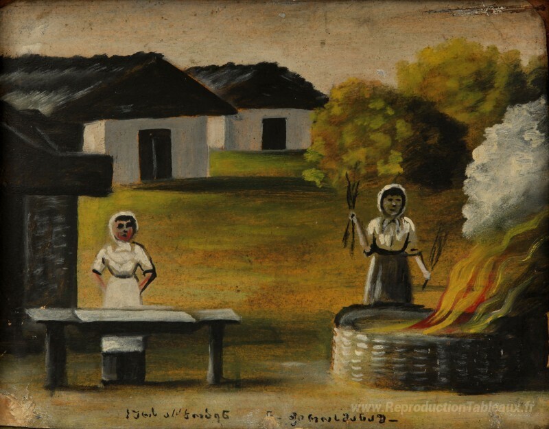 Nous vous proposons une reproduction artisanale sur toile du célèbre tableau 'La cuisson du pain' de Niko Pirosmani, provenant du Musée de la Reproduction.
