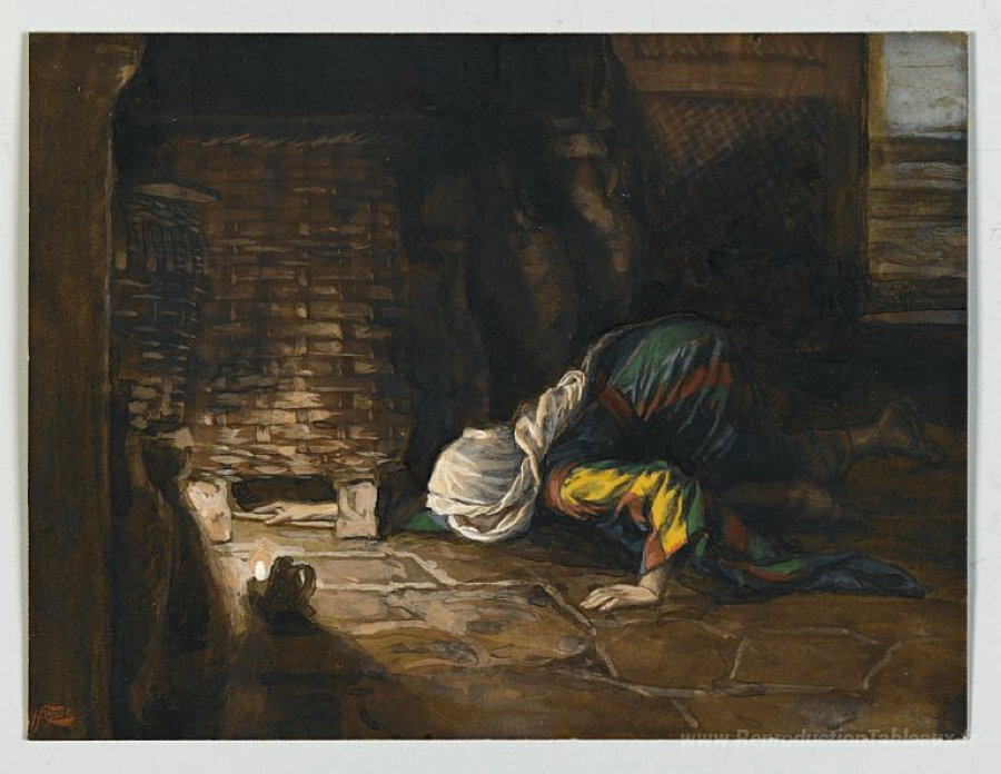 Nous vous proposons une reproduction artisanale sur toile du célèbre tableau 'La drachme perdu' de James Tissot, provenant du Musée de la Reproduction.