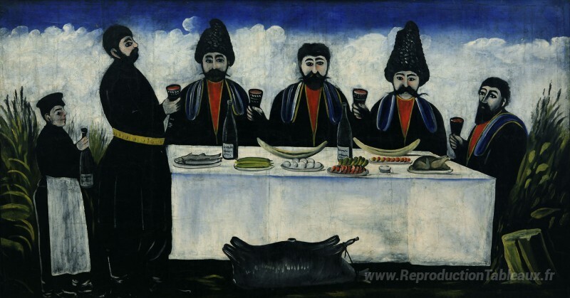 Nous vous proposons une reproduction artisanale sur toile du célèbre tableau 'La fête de quatre citoyens' de Niko Pirosmani, provenant du Musée de la Reproduction.