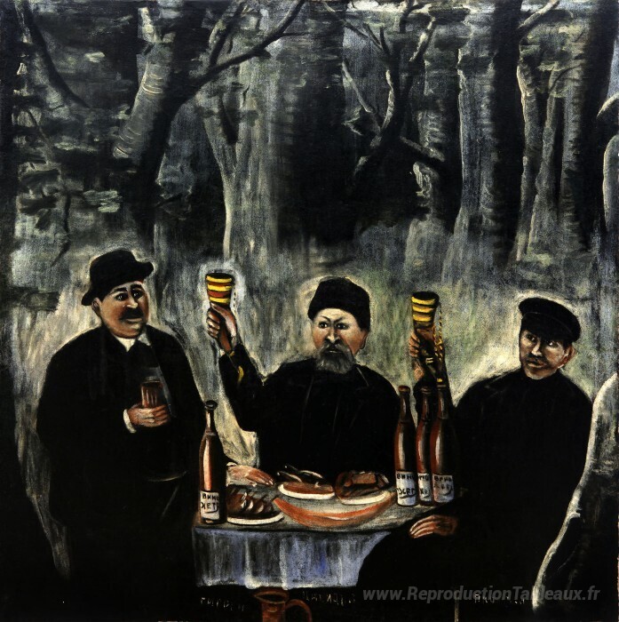 Nous vous proposons une reproduction artisanale sur toile du célèbre tableau 'La fête des citoyens dans une forêt' de Niko Pirosmani, provenant du Musée de la Reproduction.