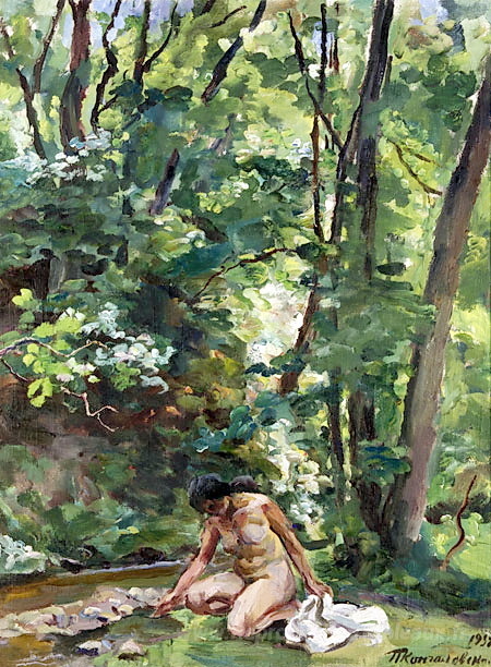 Nous vous proposons une reproduction artisanale sur toile du célèbre tableau 'La femme au ruisseau' de Pyotr Konchalovsky, provenant du Musée de la Reproduction.