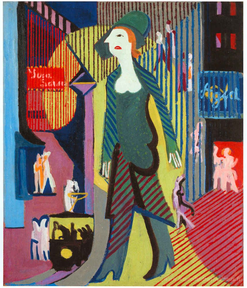 Nous vous proposons une reproduction artisanale sur toile du célèbre tableau 'La femme marche sur une rue nocturne' de Ernst Ludwig Kirchner, provenant du Musée de la Reproduction.