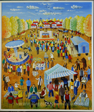 Nous vous proposons une reproduction artisanale sur toile du célèbre tableau 'La foire de mon enfance' de Radi Nedelchev, provenant du Musée de la Reproduction.