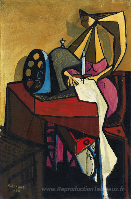 Nous vous proposons une reproduction artisanale sur toile du célèbre tableau 'La Máquina de Coser' de Oscar Dominguez, provenant du Musée de la Reproduction.