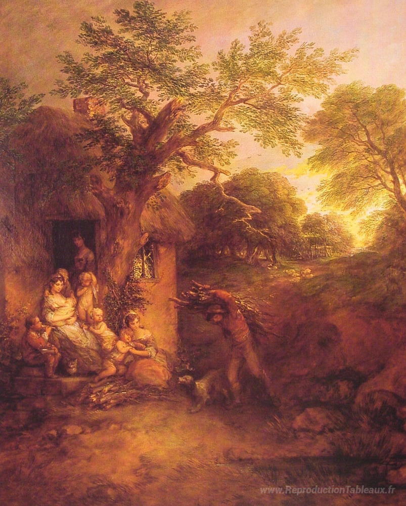 Nous vous proposons une reproduction artisanale sur toile du célèbre tableau 'La maison du bûcheron' de Thomas Gainsborough, provenant du Musée de la Reproduction.