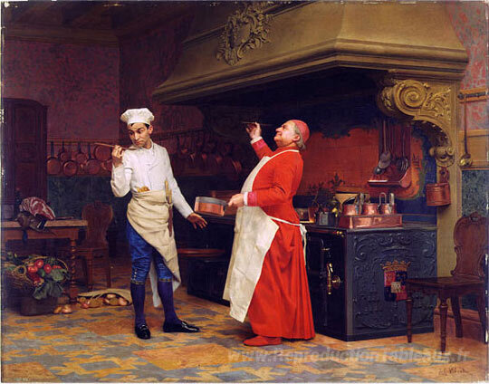Nous vous proposons une reproduction artisanale sur toile du célèbre tableau 'La merveilleuse sauce' de Jehan Georges Vibert, provenant du Musée de la Reproduction.
