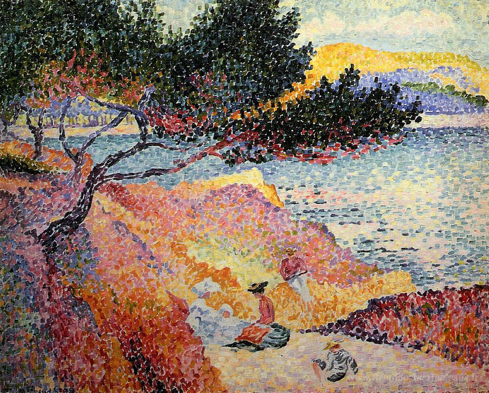 Nous vous proposons une reproduction artisanale sur toile du célèbre tableau 'La Page de Saint-Clair' de Henri-Edmond Cross, provenant du Musée de la Reproduction.