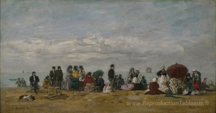 Nous vous proposons une reproduction artisanale sur toile du célèbre tableau 'La plage de Trouville' de Eugene Boudin, provenant du Musée de la Reproduction.