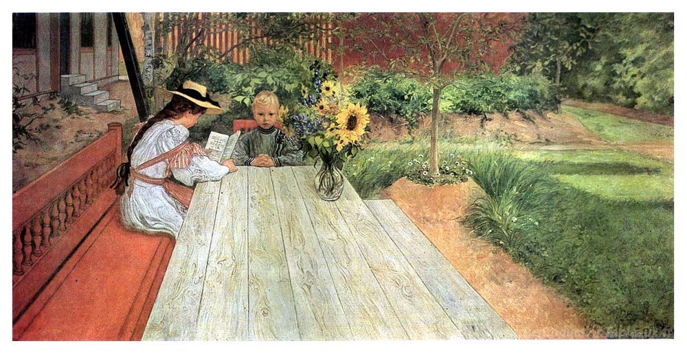 Nous vous proposons une reproduction artisanale sur toile du célèbre tableau 'La première leçon' de Carl Larsson, provenant du Musée de la Reproduction.