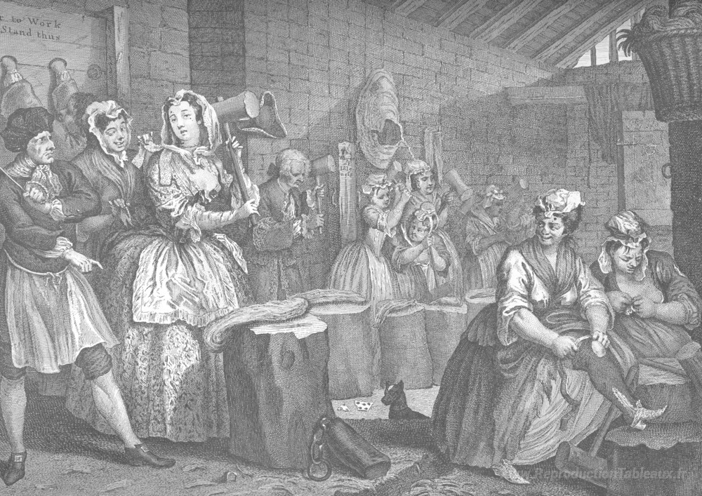 Nous vous proposons une reproduction artisanale sur toile du célèbre tableau 'La progression d'une Harlot, planche 4' de William Hogarth, provenant du Musée de la Reproduction.