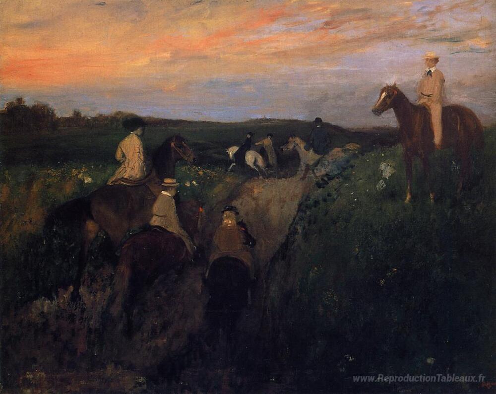 Nous vous proposons une reproduction artisanale sur toile du célèbre tableau 'La promenade à l'arrière-plan' de Edgar Degas, provenant du Musée de la Reproduction.
